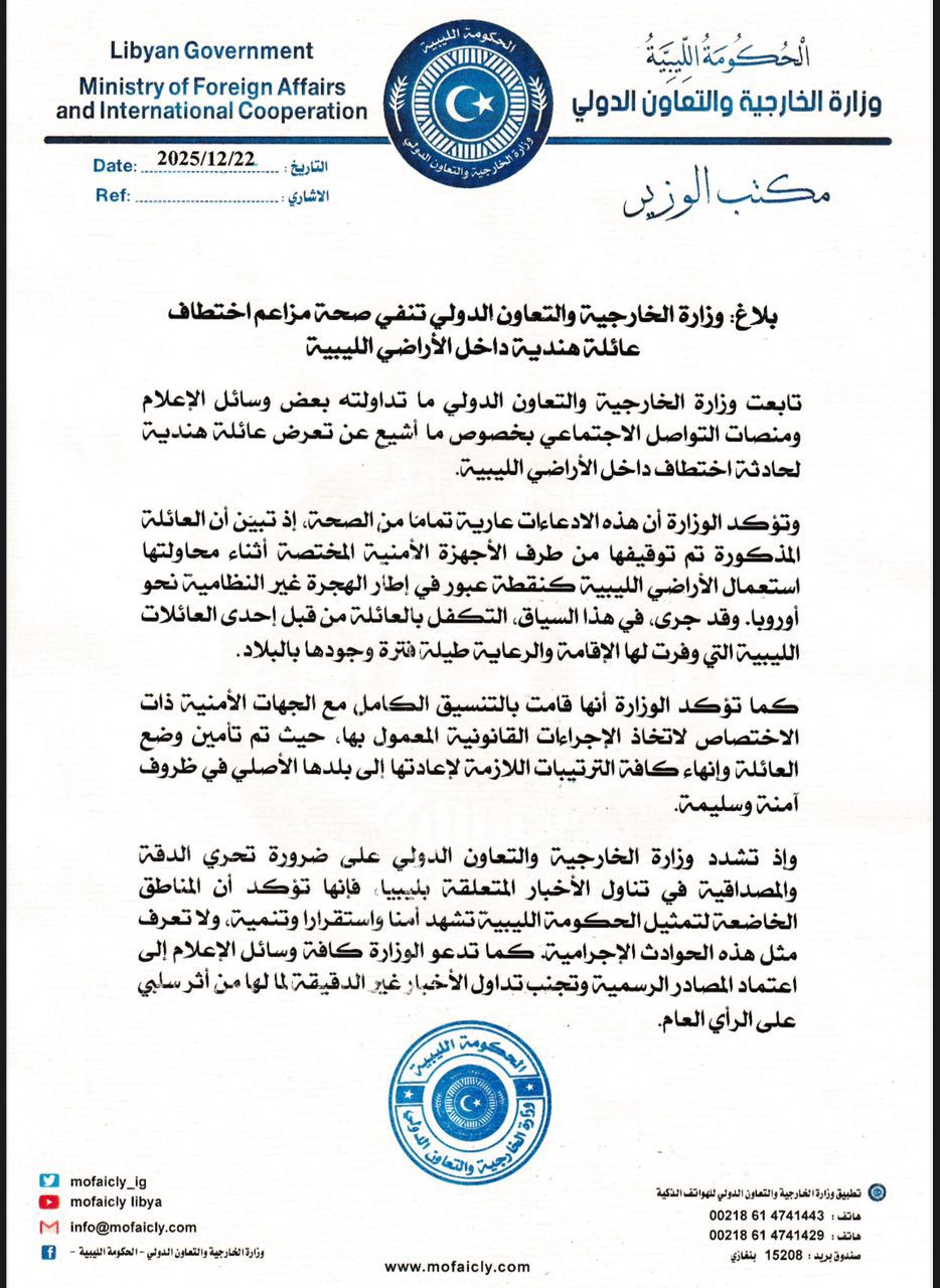 بنغازي، 22 ديسمبر 2025 – نفى وزارة الخارجية والتعاون الدولي في الحكومة المكلفة من قبل البرلمان صحة التقارير التي تداولتها بعض وسائل الإعلام ومنصات التواصل الاجتماعي حول تورط عائلة هندية في حادثة اختطاف داخل الأراضي الليبية.
