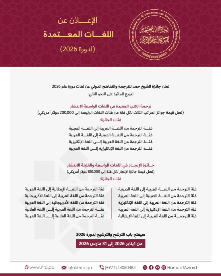 The award had announced the languages for the 2026 cycle several months ago, a step aimed at giving translators and relevant institutions a longer period to prepare their nomination files, which enhances the quality of submissions and reinforces the award’s professional and methodological character.